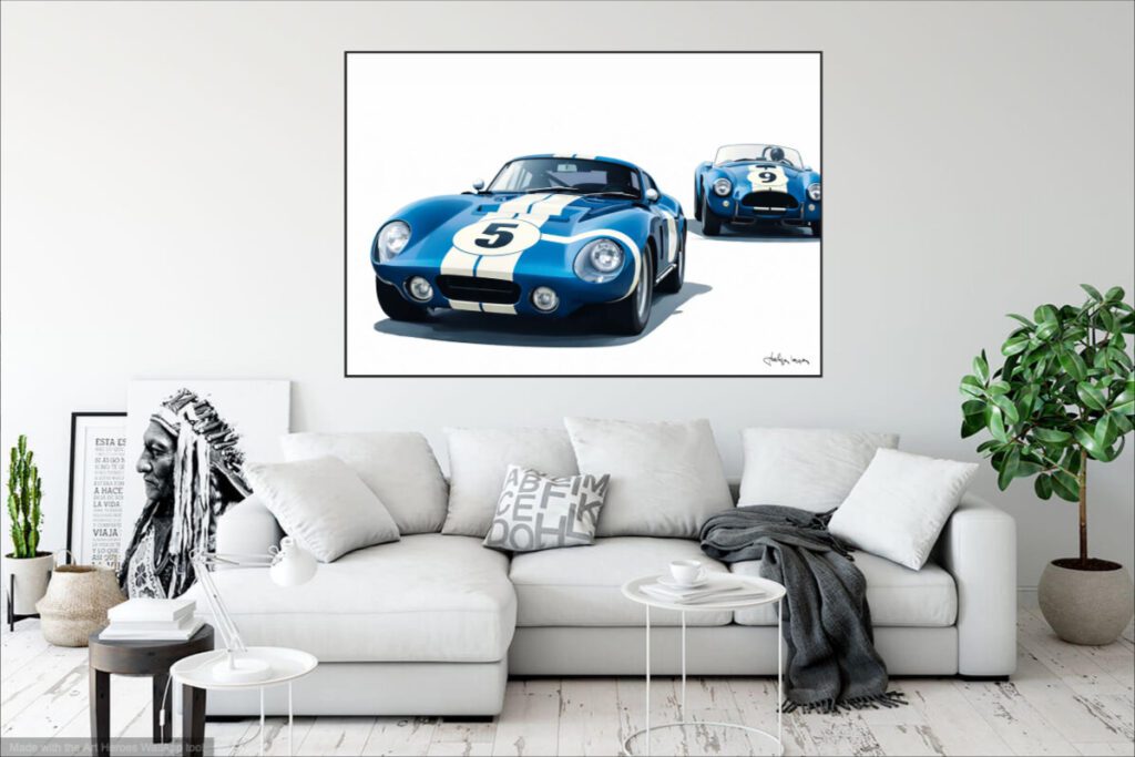 Un tableau représentant AC Cobra Daytona versus AC Cobra 427 – art print tableau trouve naturellement sa place dans un intérieur élégant, qu’il s’agisse d’un salon contemporain, d’un bureau de passionné ou d’un espace dédié à l’automobile. Il apporte une touche de caractère, de prestige et de culture mécanique.