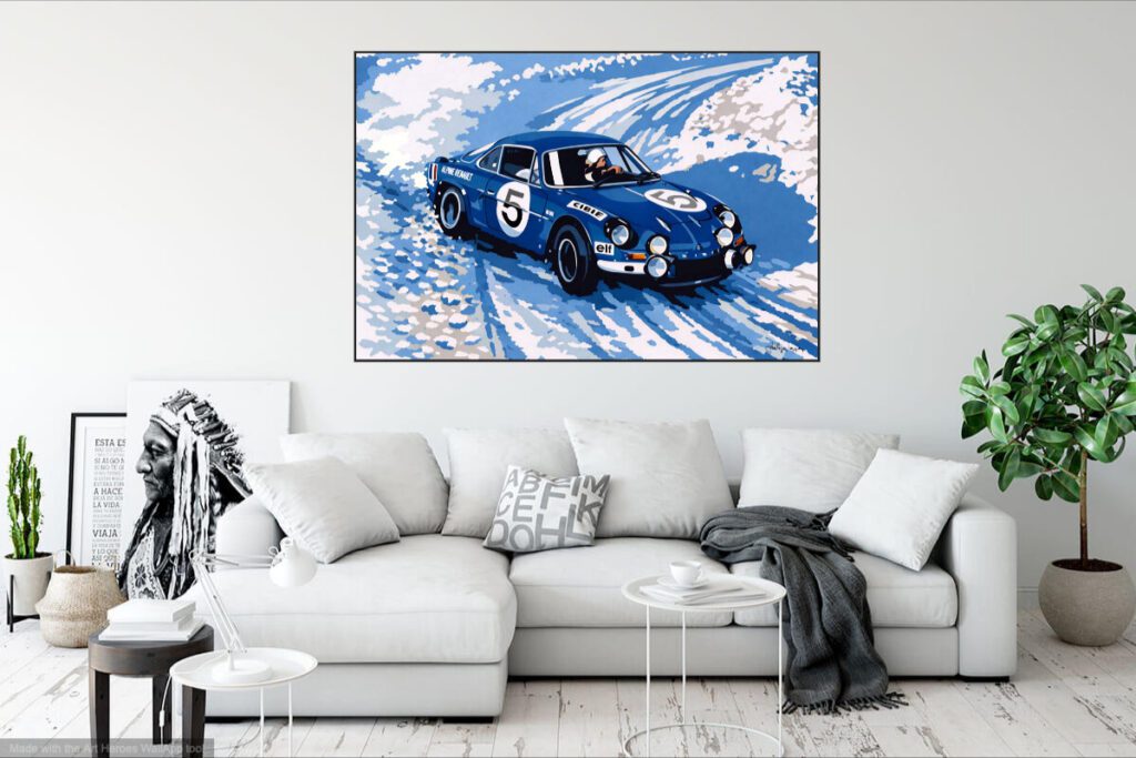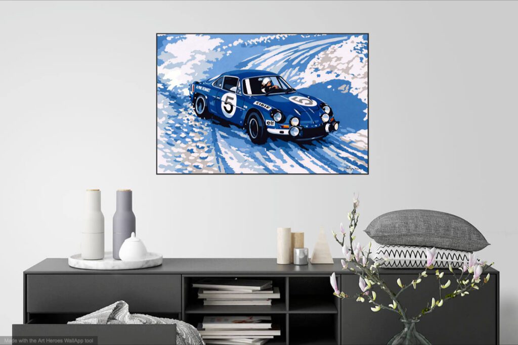 Alpine A110 rallye neige illustration mixte dessin/palette graphique 70 x 120 cm
