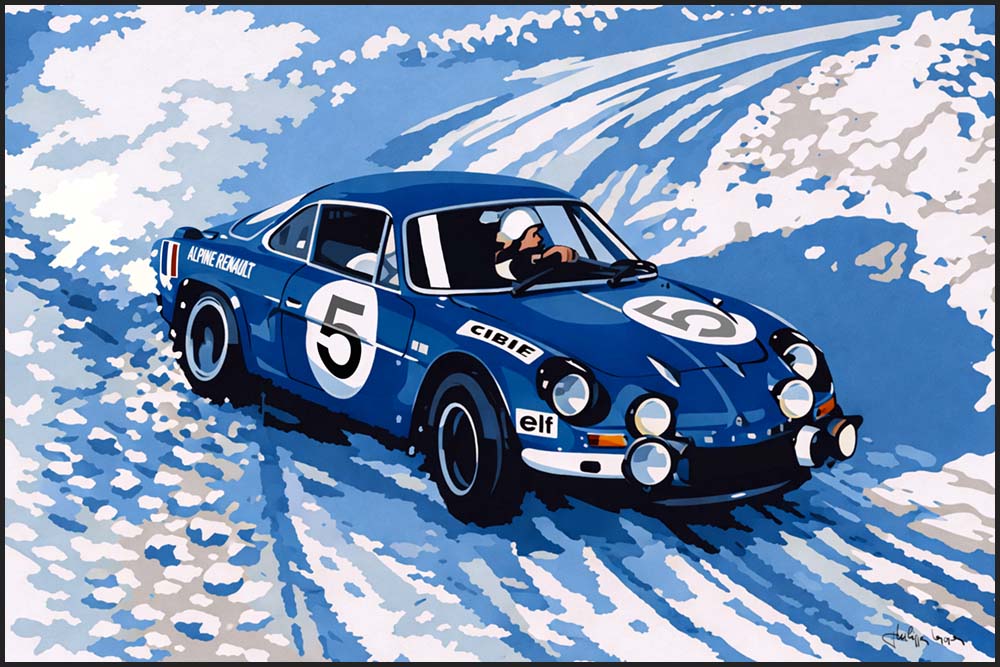 Alpine A110 rallye neige illustration mixte dessin/palette graphique 70 x 120 cm Mise en couleur et transformation artistique par Philippe Lepape Pour tout renseignement me contacter au 06 78 16 68 53 (33 6 78 16 68 53) ou la rubrique “contact“