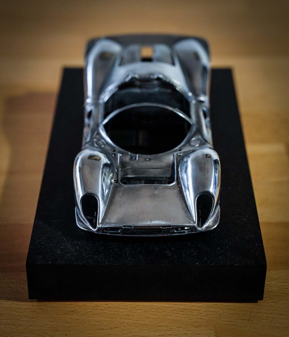 La carrosserie a les reflets de métal poli, méticuleusement travaillée, est le cœur de cet objet de décoration. Chaque ligne, chaque contour est une œuvre d’art en soi, capturant la brillance caractéristique du métal poli. Placée sur un socle noir, cette carrosserie miniature trouve l’écrin parfait pour exprimer le contraste des courbes et des volumes saisissant. Le noir du socle met en valeur l’éclat du métal poli, créant un jeu visuel captivant.