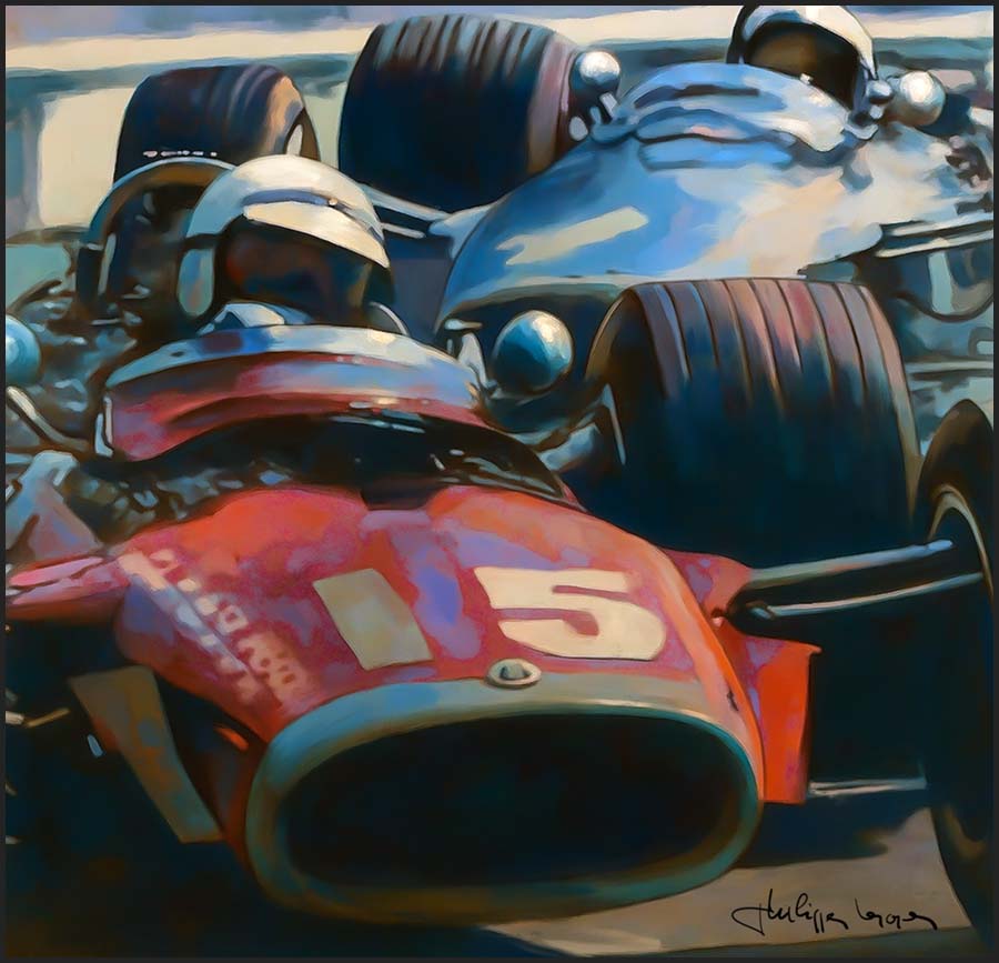 Formule 1 dans les années 60 Illustration mixte dessin/palette graphique 80 x 80 cm Philippe Lepape Renseignements A partir de mes lavis. Mise en couleur et transformation artistique par Philippe Lepape. NB : Les images dont je m’inspire sont anciennes et je ne dispose pas des noms des ayants droits je retirerai mes images de … Read more
