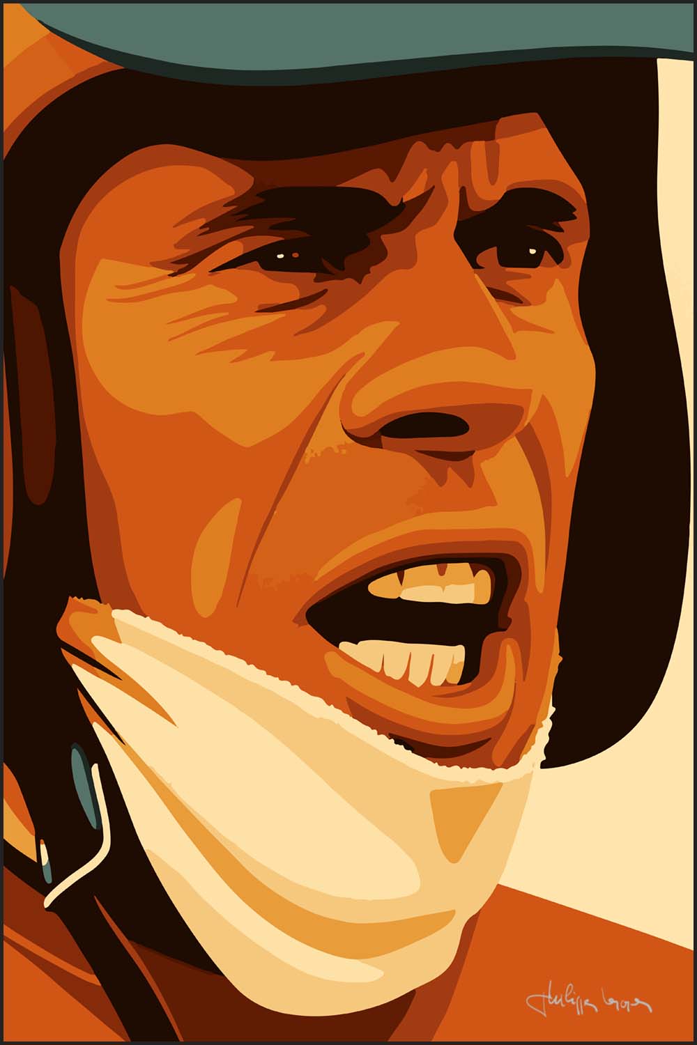 Jim Clark illustration mixte dessin/palette graphique 70 x 120 cm Mise en couleur et transformation artistique par Philippe Lepape Pour tout renseignement me contacter au 06 78 16 68 53 (33 6 78 16 68 53) ou la rubrique “contact“