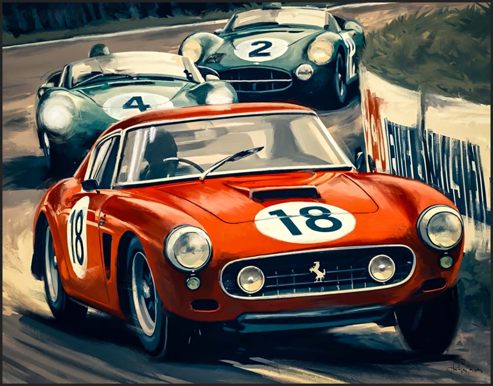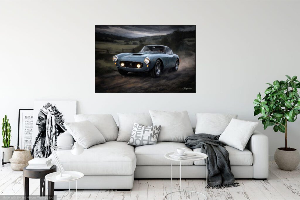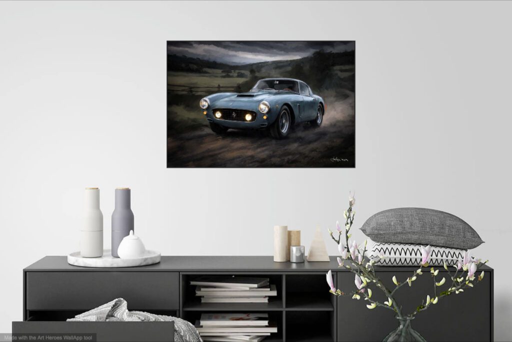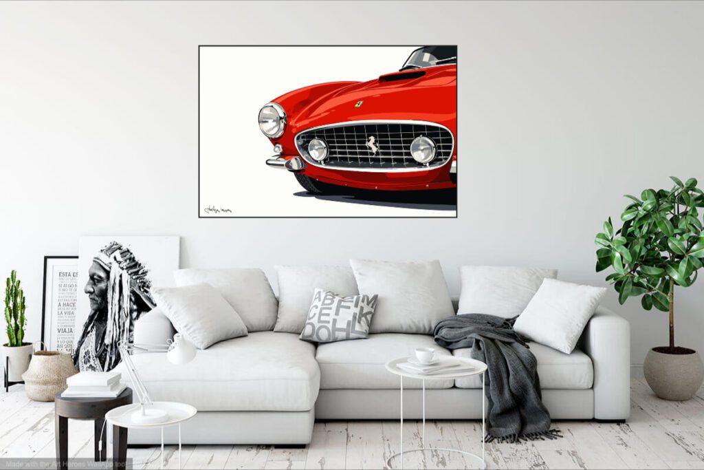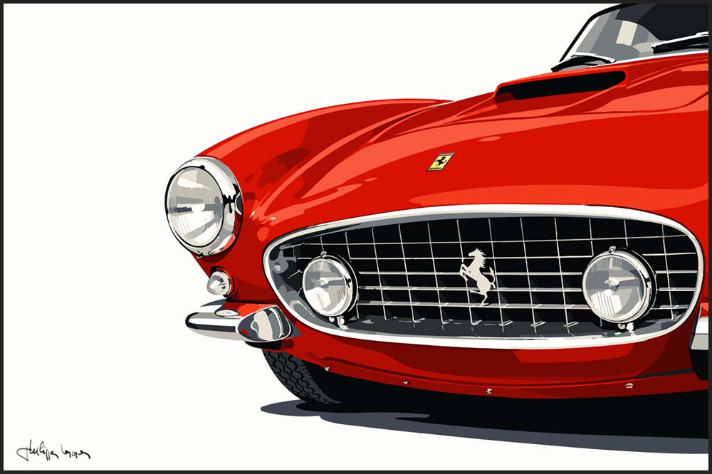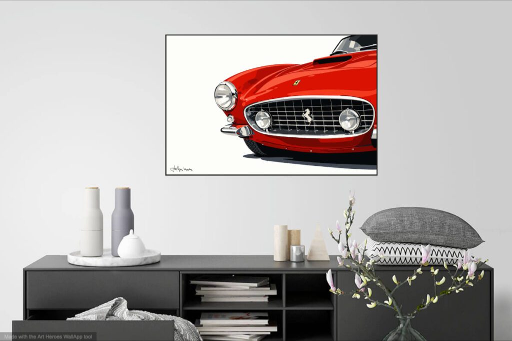 Ferrari 250 Berlinetta SWB sur la piste série d’illustrations mixtes dessin/palette graphique 70 x 100 cm