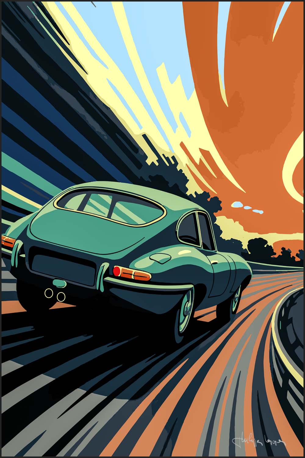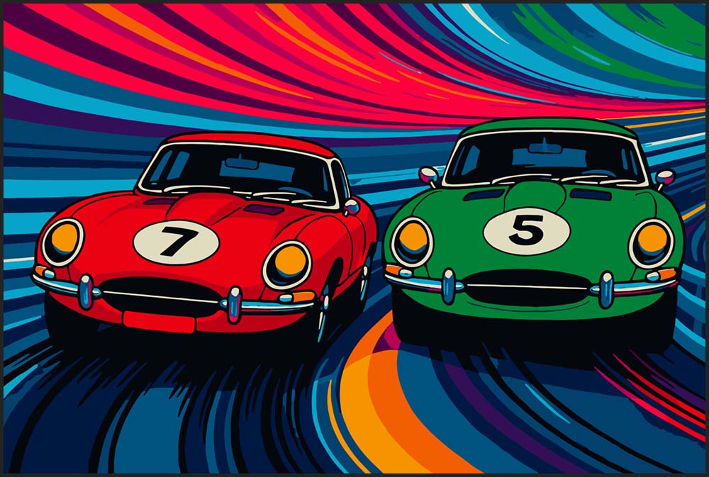 Mon approche du Pop Art lié à l’automobile s’inspire directement de ce mouvement né dans les années 1950, caractérisé par des couleurs intenses, des contrastes marqués et une approche graphique qui sublime la réalité. À travers des jeux de teintes éclatantes et des effets de mouvement accentués, mes œuvres retranscrivent toute la fougue et le charisme des voitures mythiques.