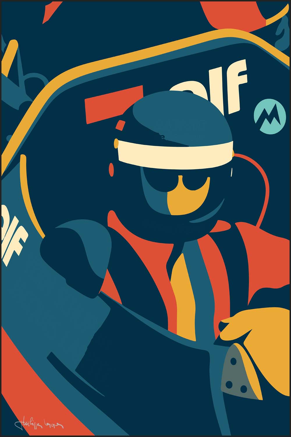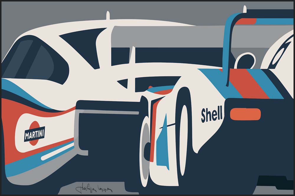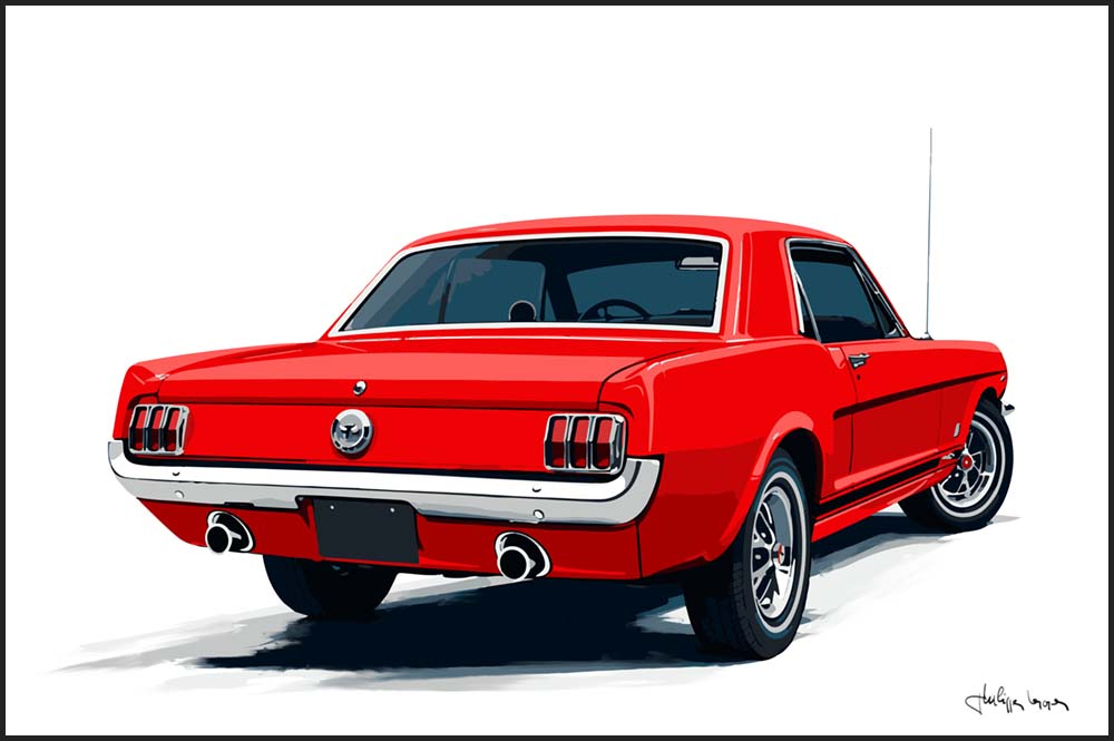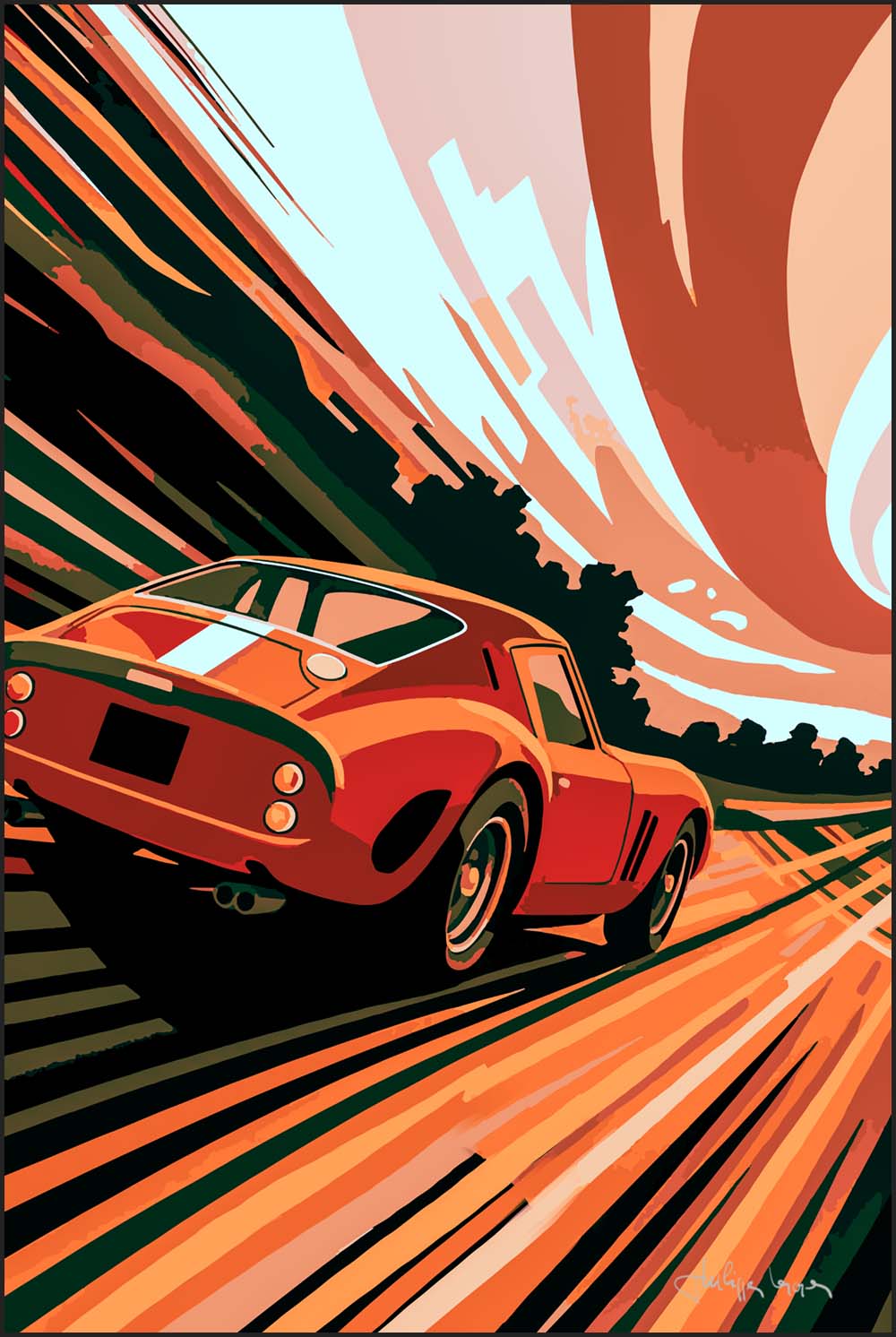 J’utilise différentes techniques mixtes alliant dessin sur tablette graphique façon acrylique pour des impressions sur toile, enrichies par des éléments graphiques inspirés de la culture pop. L’idée est d’associer le réalisme du dessin automobile à l’énergie explosive des palettes chromatiques du Pop Art, tout en intégrant la clarté et la simplicité du minimalisme. Chaque coup de pinceau est pensé pour accentuer le dynamisme, tandis que les arrières-plans sont travaillés pour amplifier la sensation de vitesse et de puissance.