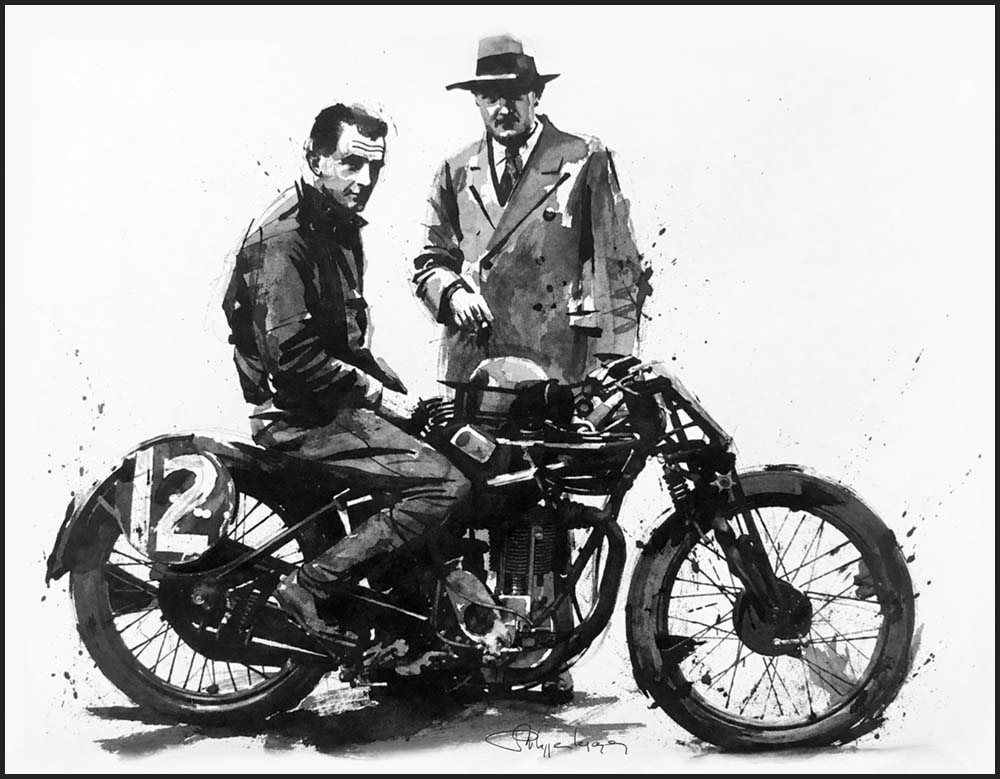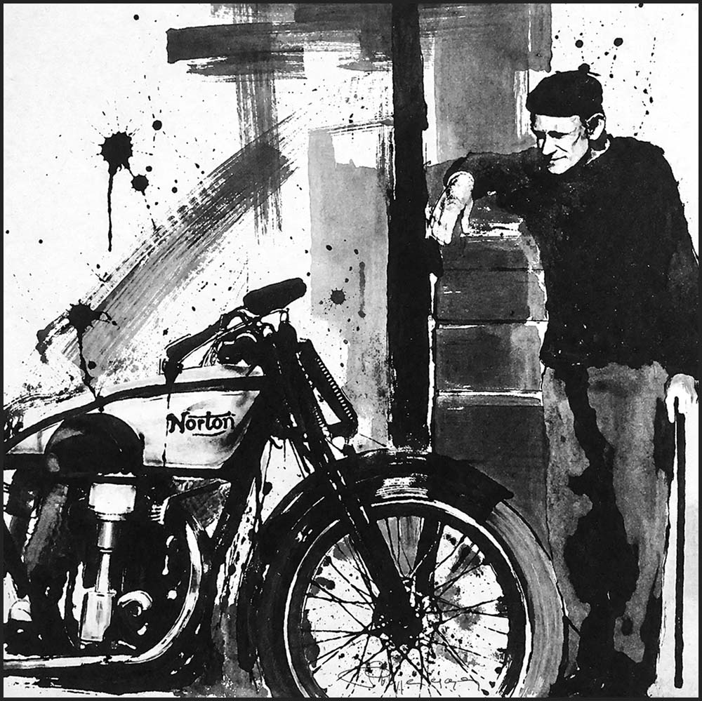 À travers mes lavis d’encre de Chine, mes aquarelles et mes techniques mixtes, je rends hommage aux motos, side-cars et pilotes légendaires qui ont marqué l’histoire des courses entre les années 1950 et 1970 — une époque mythique, synonyme de vitesse, de courage et d’émotion pure.