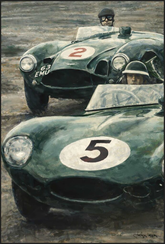 Illustration Jaguar D et Aston Martin DBR dans la course – art print tableau 81 x 112 cm technique mixte dessin/palette graphique
