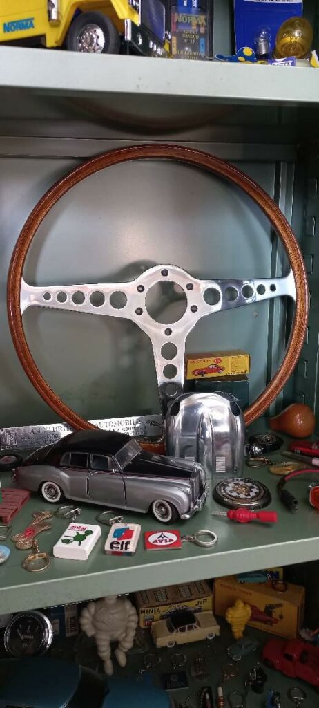 Cette création artistique est issue d’un jouet miniature en métal récupéré de Jaguar Type E, soigneusement démonté puis réassemblé. Les éléments d’origine sont conservés et détournés afin de révéler leur potentiel graphique : ouvertures, nervures, volumes et reliefs deviennent les lignes fortes de la sculpture. Les traces d’usure, marques du temps et irrégularités du métal ne sont pas dissimulées ; elles participent pleinement à l’identité de l’œuvre et témoignent de son histoire.