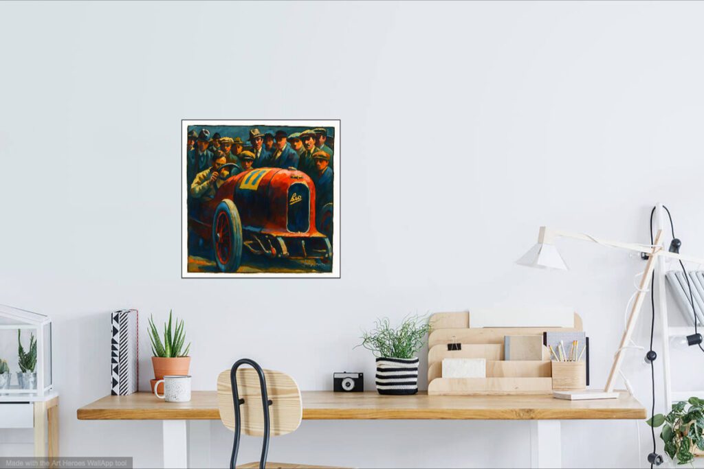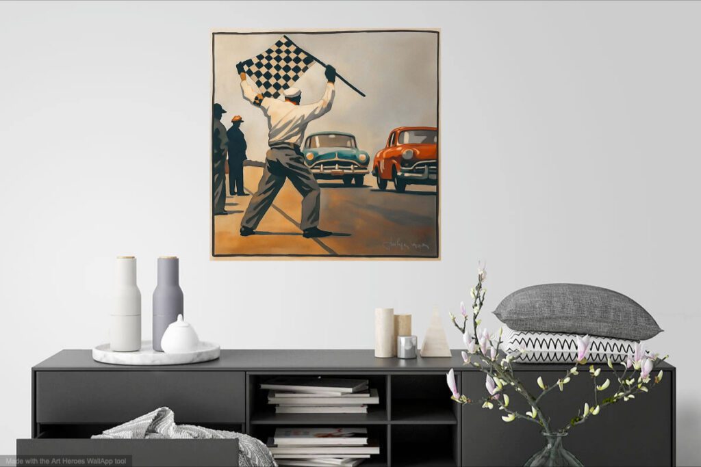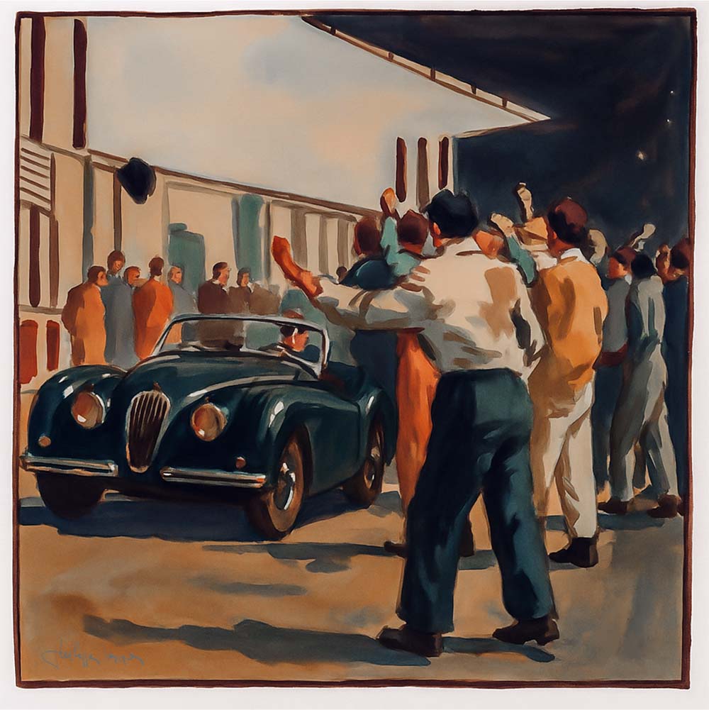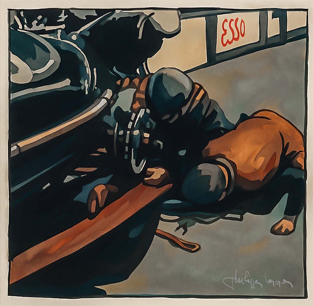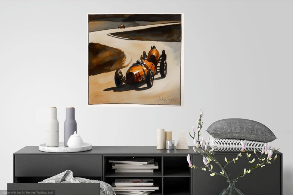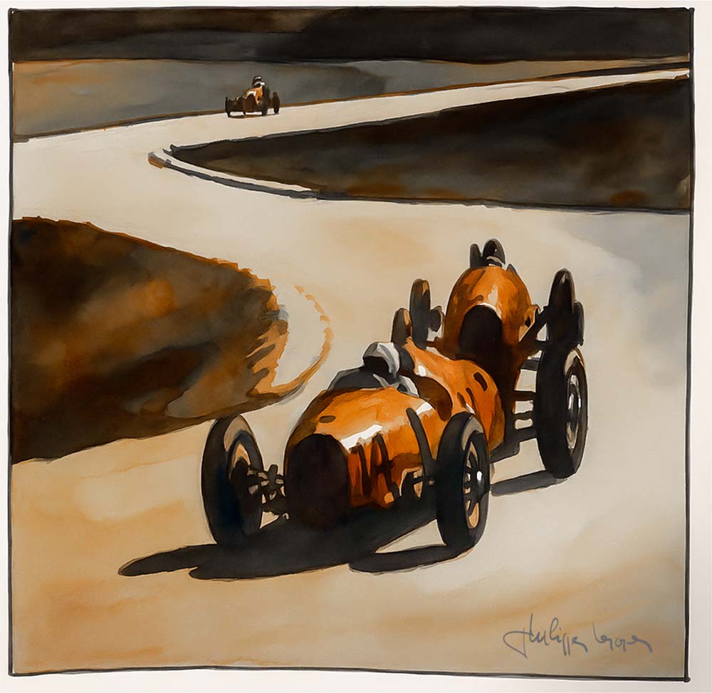 Mise en couleur de ma série “Les carrés de la course”, colorisation avec palette graphique de mes lavis d’encre de Chine à l’origine 20 x 20 cm agrandis au format carré 50 x 50 cm environ suivant visuel.