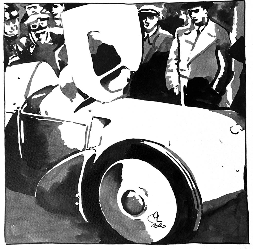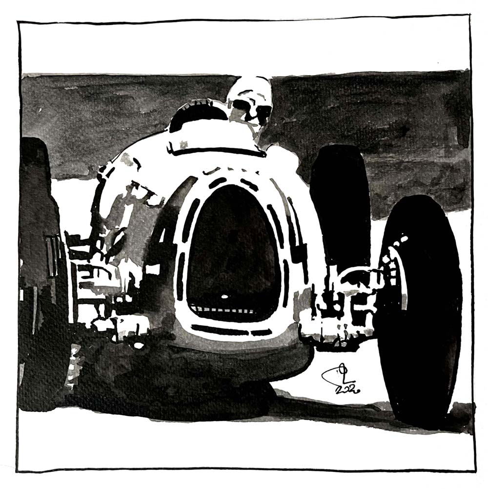 Le lavis d’encre de Chine est une technique qui permet de créer des nuances subtiles et des jeux de lumière fascinants. Dans cette série d’illustrations, j’utilise cette méthode pour donner vie à des véhicules iconiques et à des pilotes légendaires. En jouant avec l’encre et l’eau, j’ai pu obtenir des effets de profondeur, ajoutant une dimension supplémentaire à chaque illustration. Le choix du noir et blanc renforce le caractère intemporel des scènes, tout en mettant en avant la beauté des lignes et des formes des voitures et des motos.