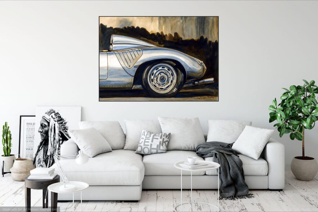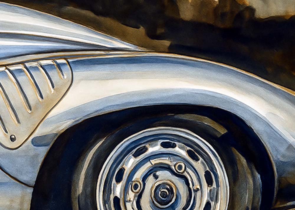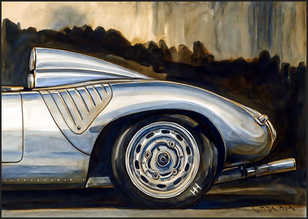 Illustration Porsche 550 Spyder vue arrière – mise en couleur d’un lavis d’encre de chine art print tableau 50 x 65 cm