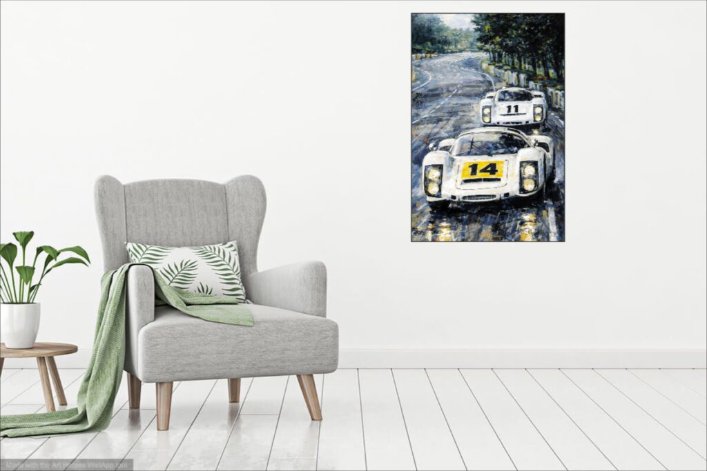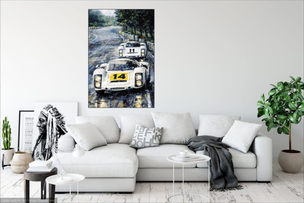 Illustration Porsche 907 – art print tableau 78 x 119 cm – librement inspirée de plusieurs photos vue dans des journaux.