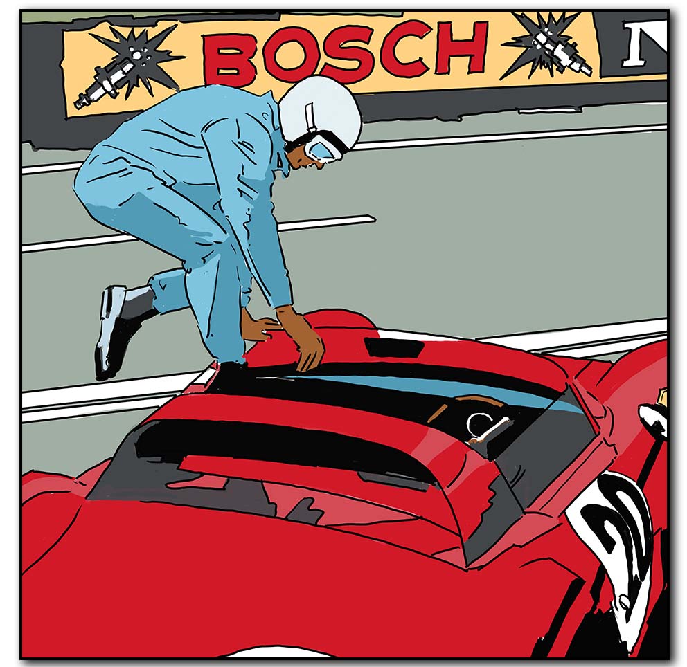 J’utilise différentes techniques mixtes alliant dessin sur tablette graphique façon acrylique pour des impressions sur toile, enrichies par des éléments graphiques inspirés de la culture pop. L’idée est d’associer le réalisme du dessin automobile à l’énergie explosive des palettes chromatiques du Pop Art, tout en intégrant la clarté et la simplicité du minimalisme. Chaque coup de pinceau est pensé pour accentuer le dynamisme, tandis que les arrières-plans sont travaillés pour amplifier la sensation de vitesse et de puissance.