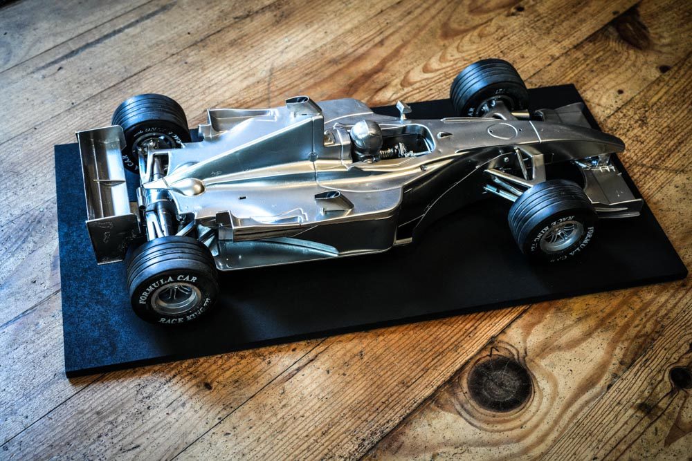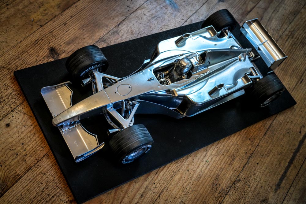 À l’échelle 1/8, la sculpture restitue l’élan et la dynamique des véhicules de course, tout en offrant une interprétation artistique originale. La finition chromée peinte capte la lumière et reflète l’espace environnant, donnant à chaque pièce un éclat unique et changeant selon l’angle de vue.