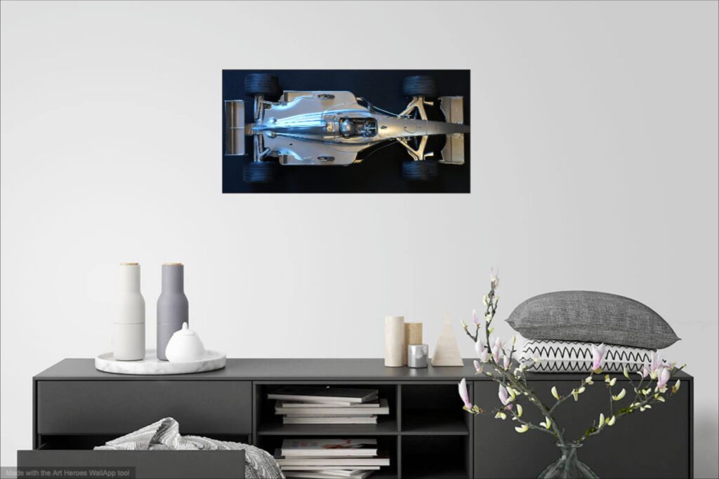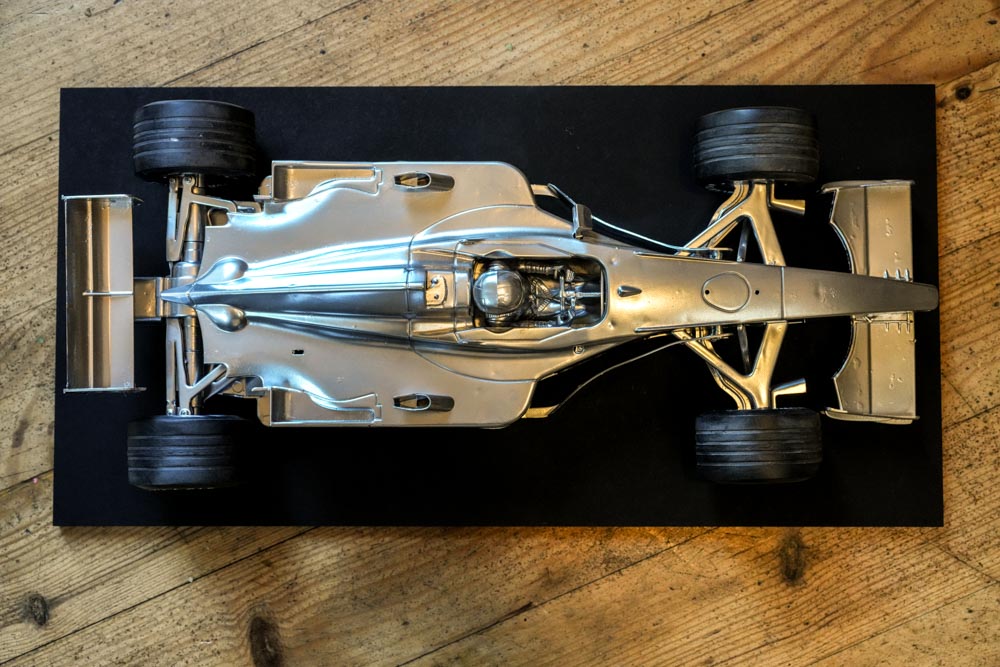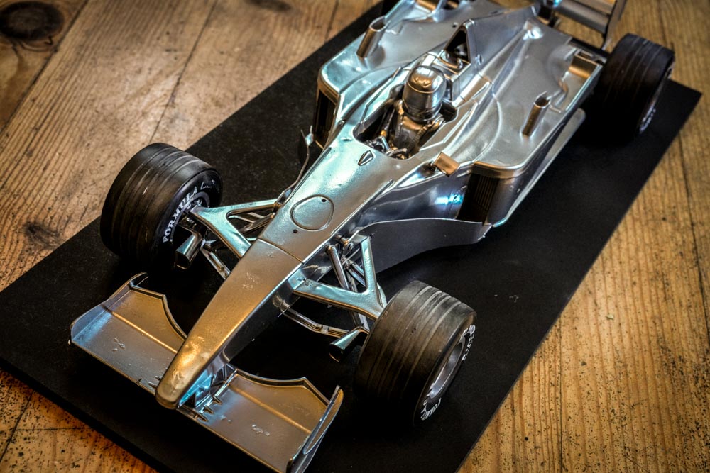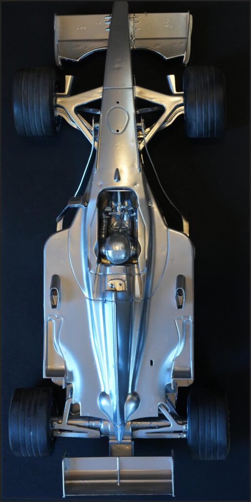 Cette Ferrari F1 300 n’est plus un simple véhicule miniature : elle renaît ici comme une sculpture d’art contemporain, figée dans un éclat de chrome, suspendue entre mouvement et immobilité.