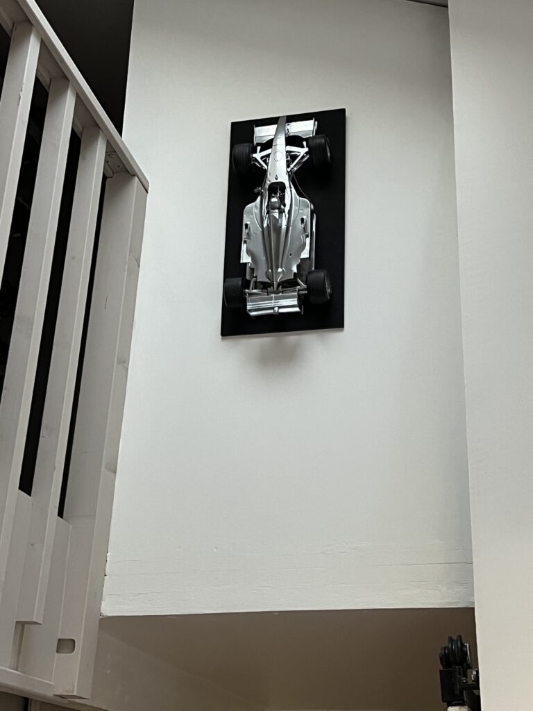 Elle habite le mur comme un fragment de rêve : celui d’une machine arrêtée en plein élan, d’une course suspendue dans le temps.