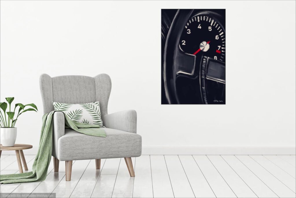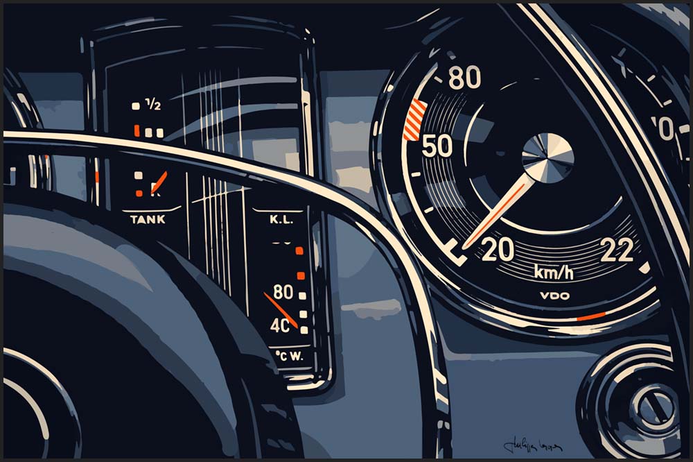 Mes tableaux se concentrent sur des plans serrés, volontairement immersifs. Le cadre se resserre jusqu’à enfermer le spectateur dans l’habitacle, à la place du conducteur. Il n’y a plus d’extérieur, plus de carrosserie : seulement l’instant suspendu de la conduite, le face-à-face avec la machine. Le regard est happé par la juxtaposition des cadrans, par le rythme circulaire des compteurs, par la tension silencieuse qui précède l’accélération.