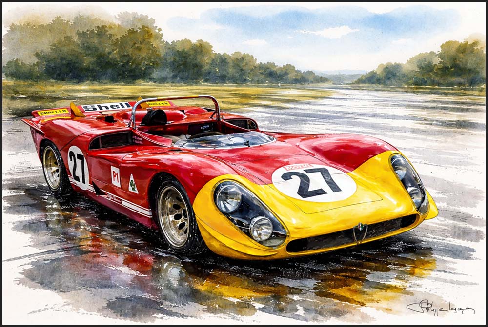 Mon approche mêle expression picturale et rigueur technique, pour révéler toute la grâce et la puissance des Alfa Romeo sur la route ou sur circuit.