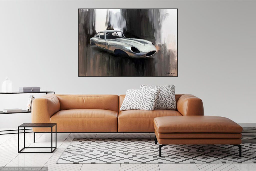 Ces tableaux automobile carrosserie à nue plongent le spectateur au cœur de l’essence même de l’automobile — sans roues, sans accessoires, sans artifice. L’attention se concentre sur l’architecture du châssis et sur la sculpture métallique du véhicule, mise en lumière par un lavis numérique et une palette graphique maîtrisée. C’est un hommage au dessin industriel et à la beauté intemporelle de l’ingénierie automobile.